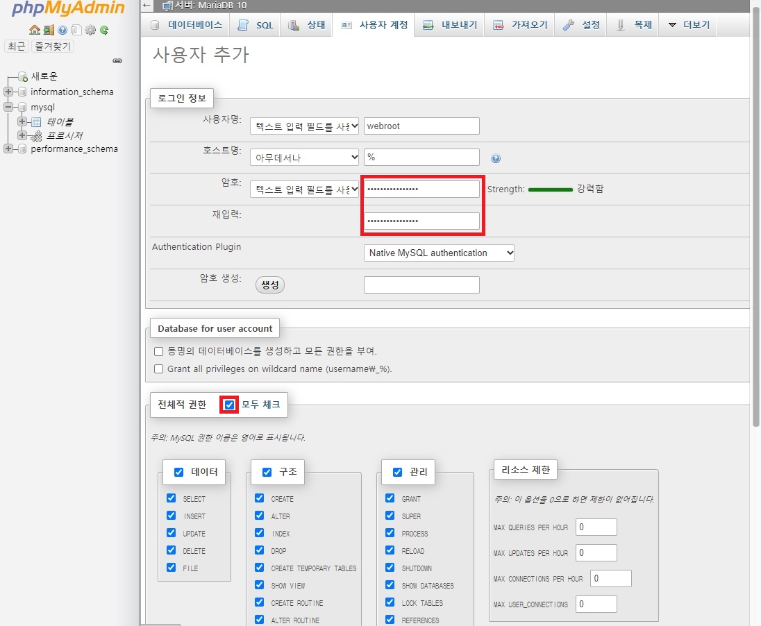 일단 패스워드 입력 조건이 리눅스에 MariaDB 설치하고 패스워드 입력조건보다 좀 까다롭다.