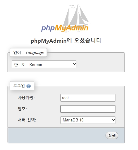 이후 DB생성이나 사용자 생성 테이블 등등은 phpMyAdmin 을 쓰거나 다른 DB 접속 클라이언트로