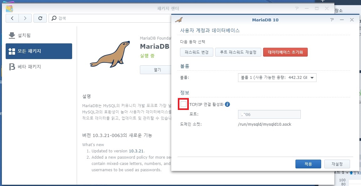 시놀로지에서 MariaDB를 써야하는 패키지는 설치하는 과정에서 정보만 입력해주면 되지 별도로 위와 같은 수동 처리를 할 필요는 없다.