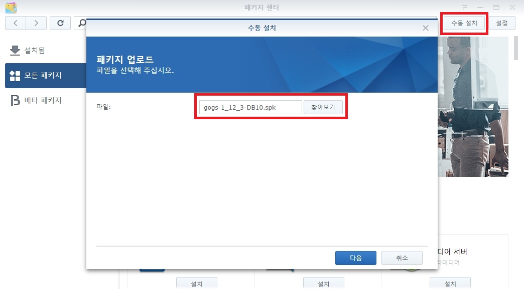 A. 먼저 다운 받은 gogs-spk-master.zip 을 시놀로지 NAS 에 업로드한다.