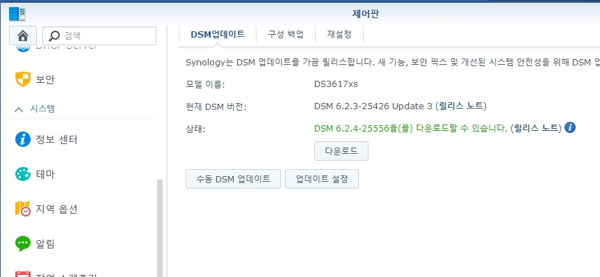 현재 DSM 6.2.3-25426 Update 3 인데 DSM 6.2.4-25556 버전이 나왓다고~~