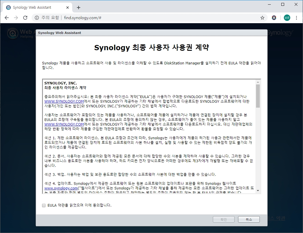 5. 연결을 누르면 시놀로지 최종 사용자 사용권 계약 이 뜬다. 동의하고 확인을 누른다.