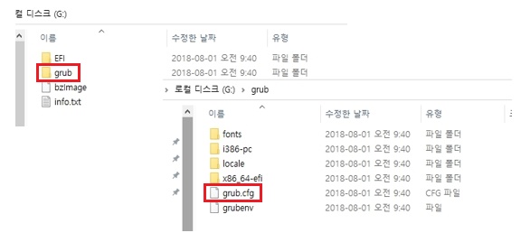 10. 여기서 grub 디렉토리로 이동 하면 "grub.cfg" 파일이 있는데 이 파일을 메모장이나 에디터로 연다.