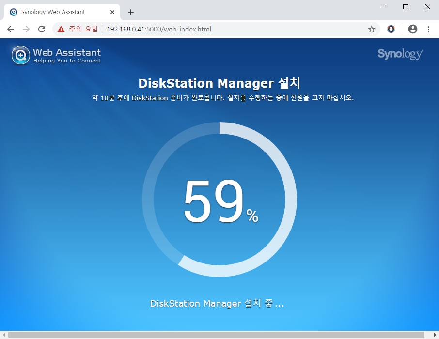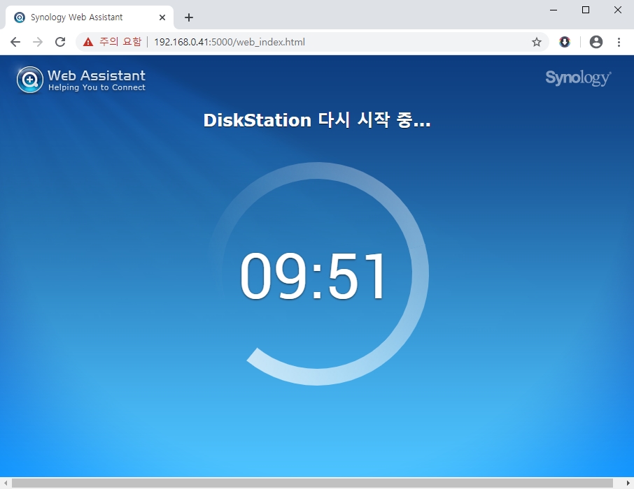 11. 설치가 100%가 되어 설치가 끝나면 헤놀로지는 재부팅을 두번정도 하고 그동안 화면에는 아래 같은