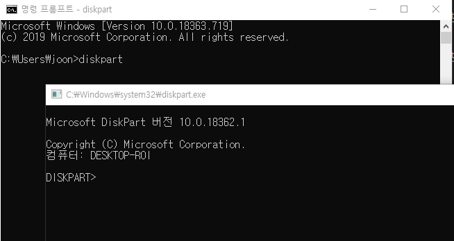 2. 프롬프트 창에서 diskpart 명령을 입력한다. 그러면 새창으로 DISKPART 프롬프트가 뜸