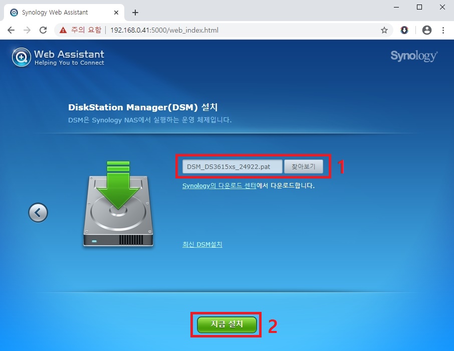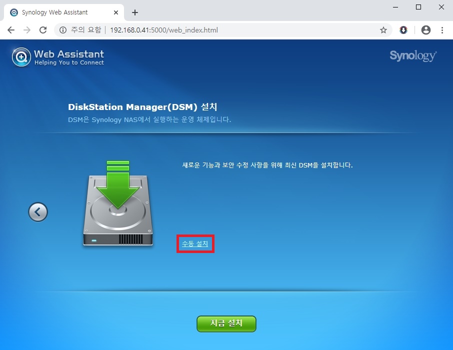 8. "수동 설치" 를 클릭하고 다운받은 DSM 파일을 선택하고 "지금 설치" 를 클릭한다.
