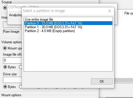 6. 그러고 나면 아래와 같은 작은 partition 창이 뜨는데 여기서 "Partition 0 - 15M" 를 선택하고 "OK" 를 클릭