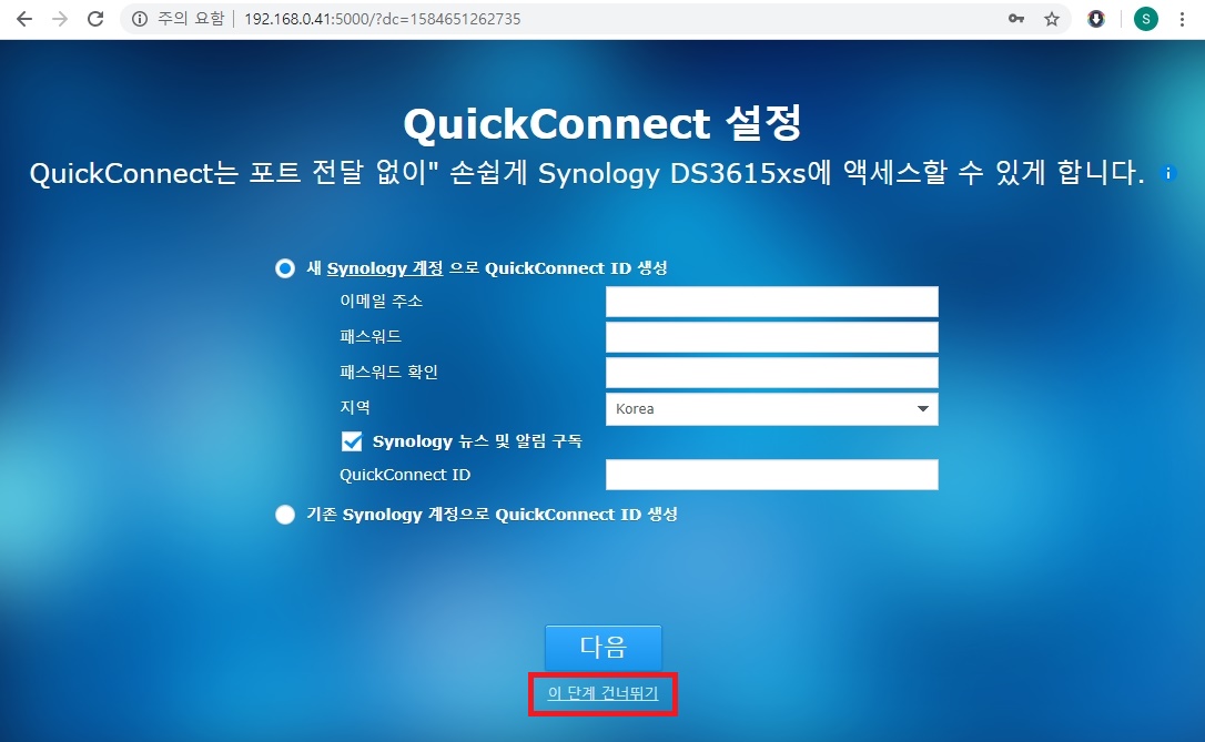 13. 우리는 정품이 아니기에 QuickConnect 를 사용할수 없으니 "이 단계 건너뛰기" 를 클릭한다.