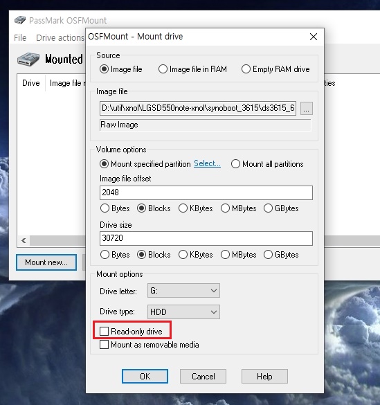 7. 위에서 Partition 선택을 하면 다음 Mount drive 창에 값들이 선택이 되며