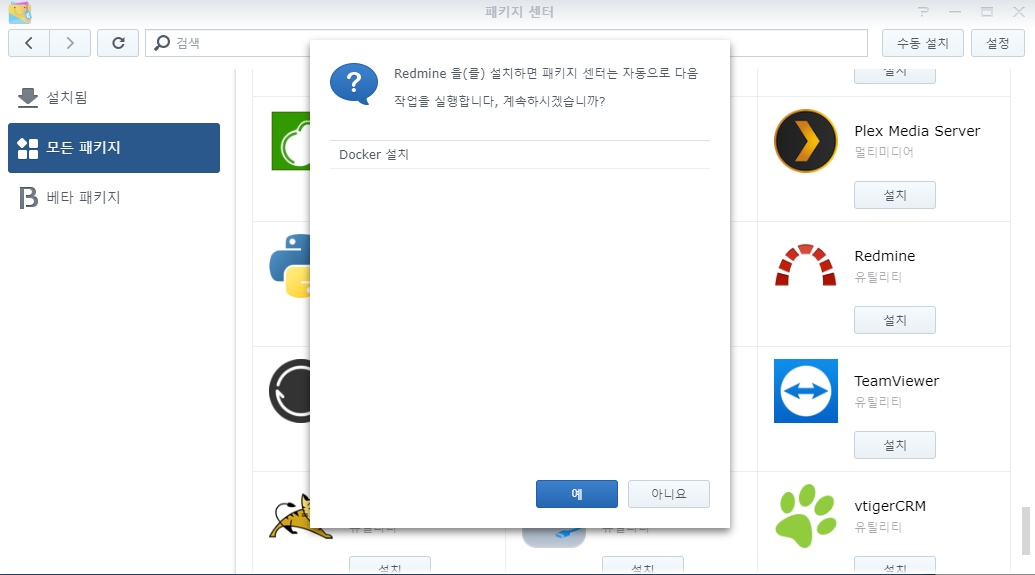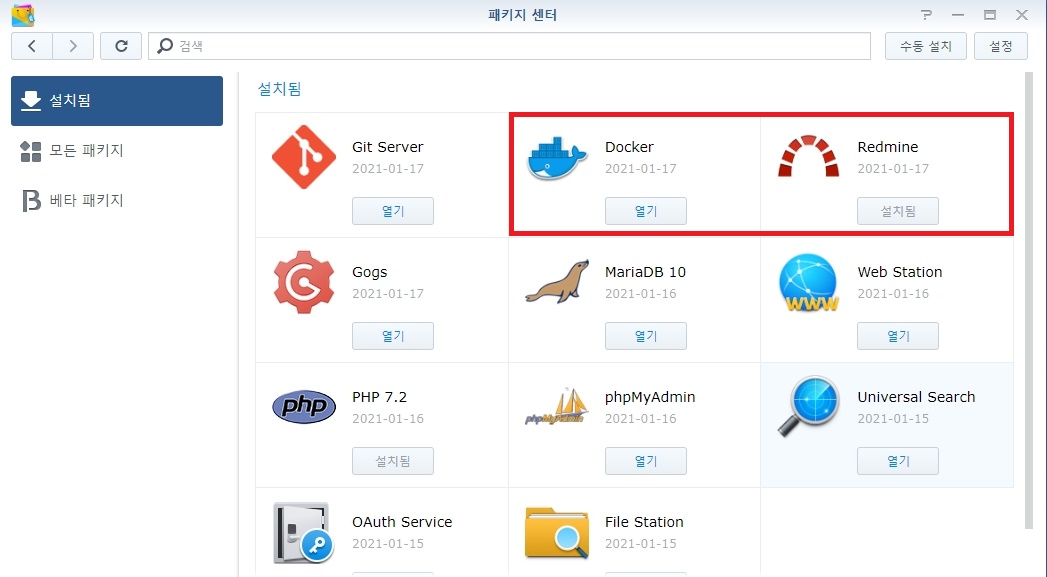 설치가 끝나면 설치된 패키지 목록에 아래처럼 Docker 와 Redmine 이 뜬다.